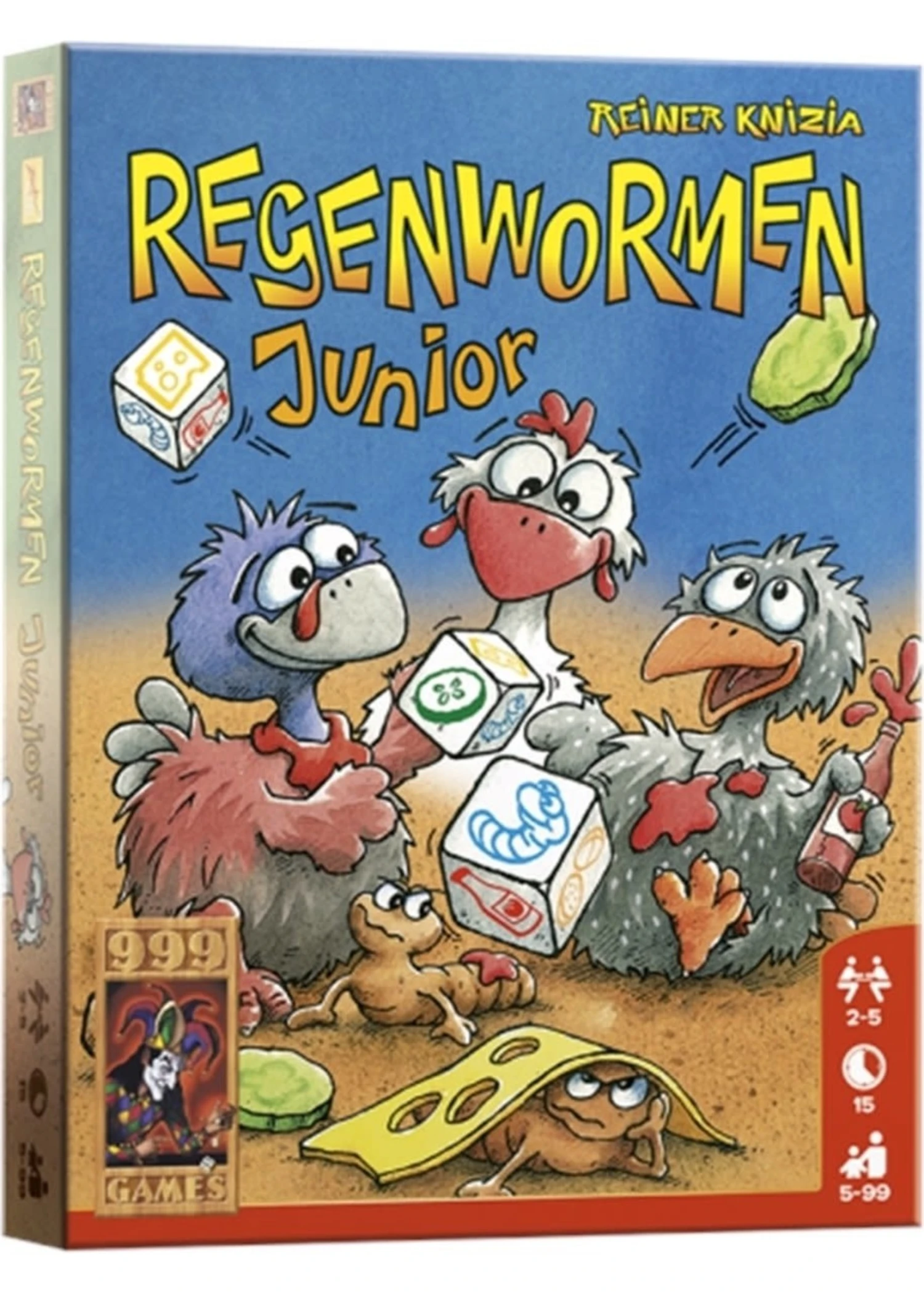 Vereenvoudigde variant van het vlotte dobbelspel Regenwormen. In deze vernieuwde versie van Regenwormen, die speciaal voor kinderen is ontwikkeld, hoeven de spelers niet meer te rekenen. Ze tellen eenvoudigweg het aantal verzamelde symbolen. Zo is dit populaire dobbelspel ook prima te spelen voor de kleintjes. Omdat het spel minder tegels bevat, duurt Regenwormen Junior niet zo lang.