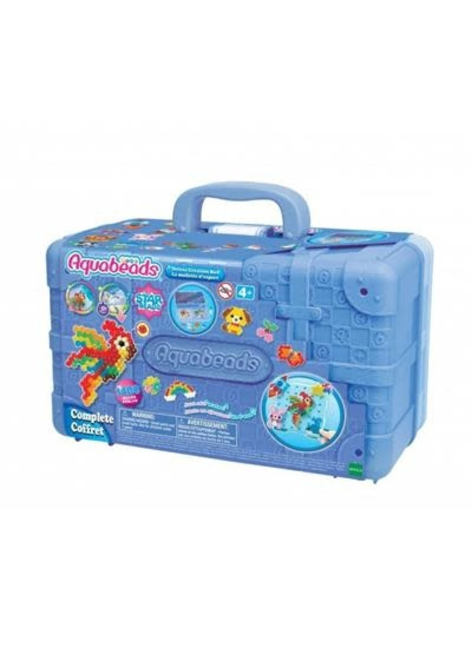 Aquabeads 31967 Deluxe Creation Box. Inhoud: 1400 beads (ook star beads), collector, watersproeier, bewaarplankje, sjabloonontwerpen omvatten een papegaai, leeuw, regenboog en andere thema’s. Geschikt vanaf 4 jaar.