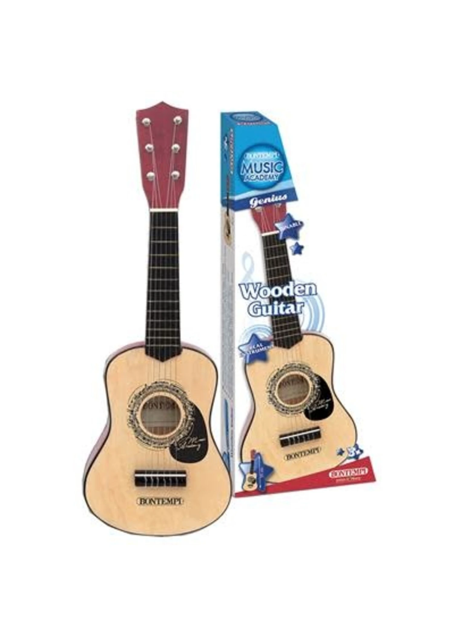 Houten kindergitaar van Bontempi. De 6 snaren kunnen gestemd worden, door aan de stemknoppen te draaien. Inclusief uitgebreide handleiding met bladmuziek en een plectrum. Het bespelen van een instrument bevordert de mentale ontwikkeling van kinderen al in de eerste jaren van het leven. Zelfs als de kleintjes nog geen goede notenreeksen kunnen spelen, moedigt het grijpen van de snaren en het horen van de geluiden de kinderen aan om zo’n speelgitaar te leren kennen. Lengte van de gitaar: 55 cm. Geschikt voor kinderen vanaf 3 jaar. Wordt geleverd in doos met handvat.