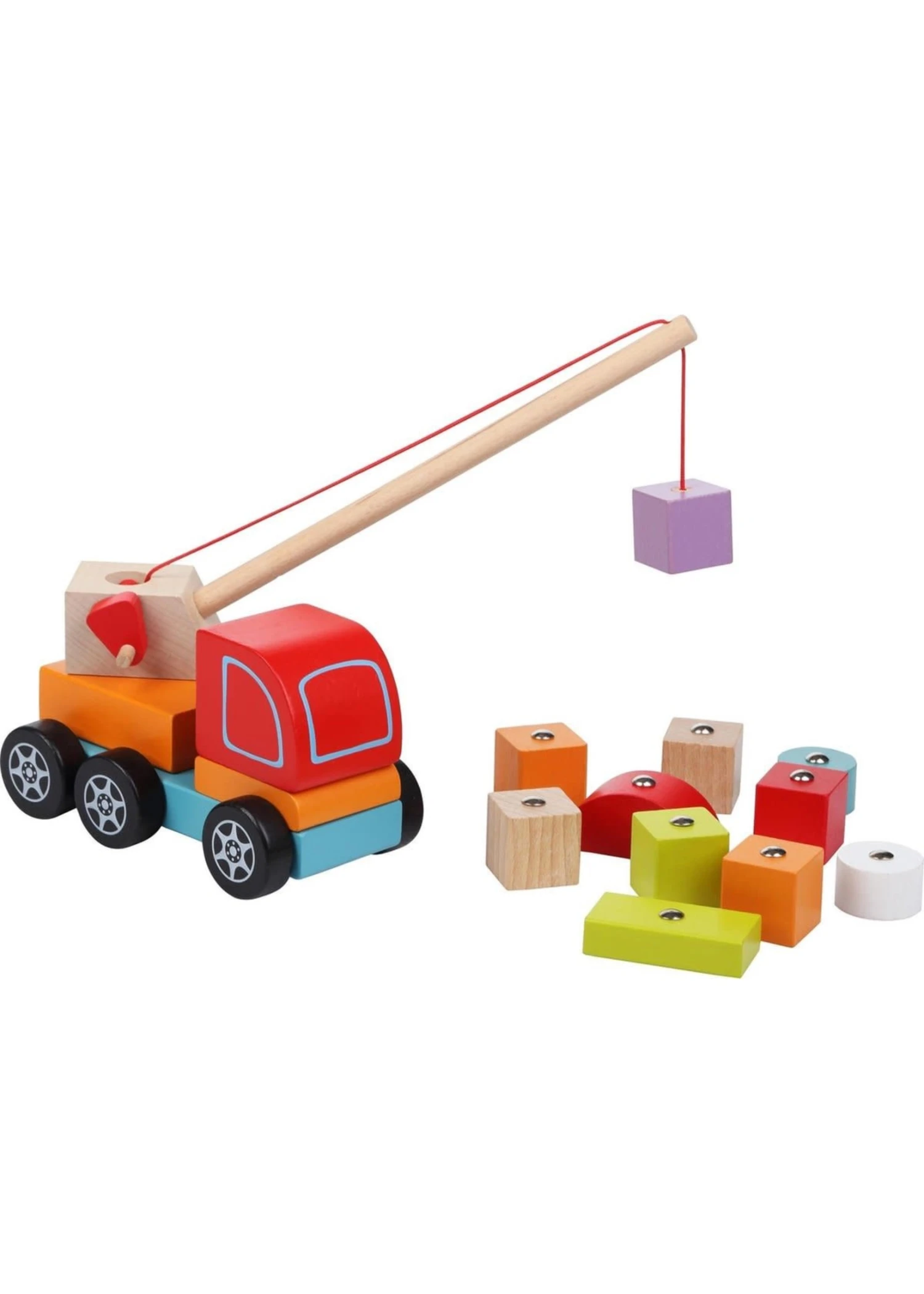 Met deze houten hijskraan til je de zwaarste blokken met het grootste gemak op! Aan de blokken en de hijskraan zijn magneetjes bevestigd waardoor je de blokken kunt oppakken, omhoog hijsen en verplaatsen.Geschikt voor kinderen vanaf 3 jaar.Afmetingen: 8,4 cm x 25 cm x 24 cm