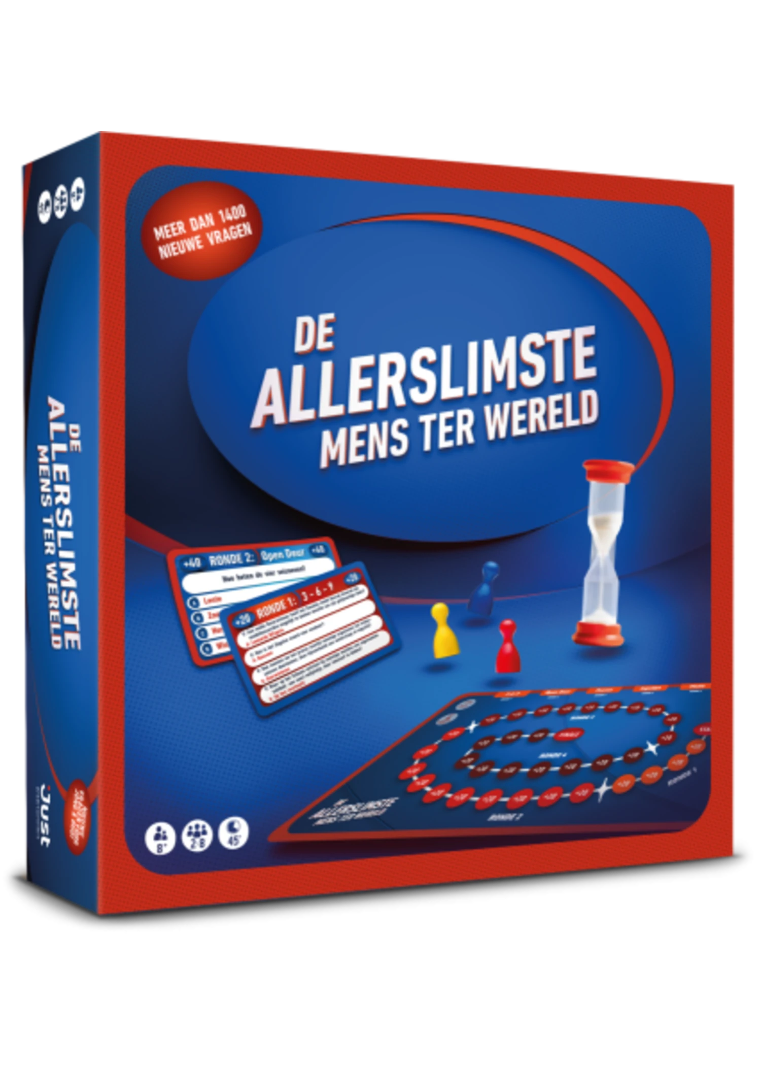 Wie van jullie is De Slimste? Speel de populaire tv-quiz De Slimste Mens Ter Wereld thuis aan tafel en ontdek in vijf spannende rondes wie van jullie De Slimste is. Alle elementen van de tv-quiz vind je terug in het bordspel: Verdien je eerste secondes met de Ronde 3-6-9; geef razendsnel de vier goede antwoorden in de Ronde Open Deur; kun jij de Puzzel oplossen terwijl jouw zuurverdiende secondes wegtikken? Hoeveel goede antwoorden weet je bij de Ronde Ingelijst? En dan moet de Finale nog beginnen: Eén vraag, vijf antwoorden. Speel je tegenstander naar 0 seconden en kroon jezelf tot De Slimste Mens ter Wereld! Met meer dan 6000 verrassende vragen en antwoorden is De Slimste Mens Ter Wereld goed voor uren spelplezier!