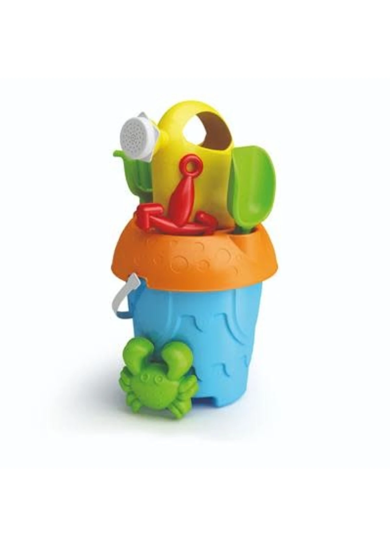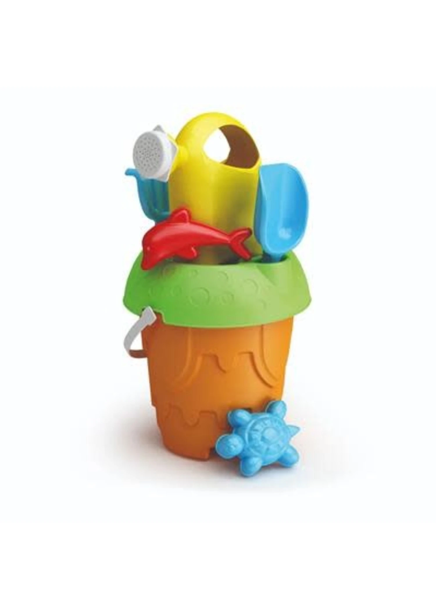 Emmerset Kasteel 7 Delig in de frisse kleuren oranje, groen, blauw, rood en geel. De strandset bestaat uit een kasteel-emmer met hengsel, zeef, gieter, harkje, schepje en twee zandvompjes. Afmeting: 18 cm. Geschikt vanaf 1 jaar.