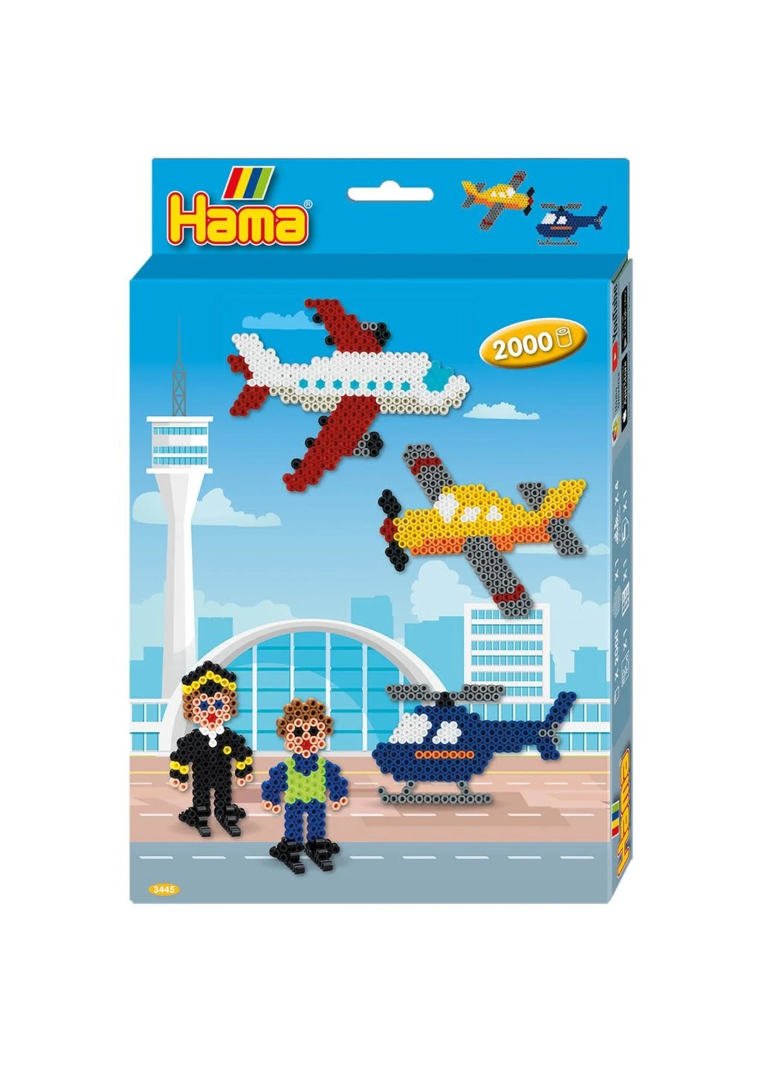 Hama strijkkralen set in vliegtuigveld thema, met 2000 multicolour kralen. Inhoud: 1 groot hexagonaal strijkkralenbordje, 4 staanders, instructies en strijkpapier. Wordt geleverd in full-colour doosje. Geschikt voor kinderen vanaf 5 jaar.