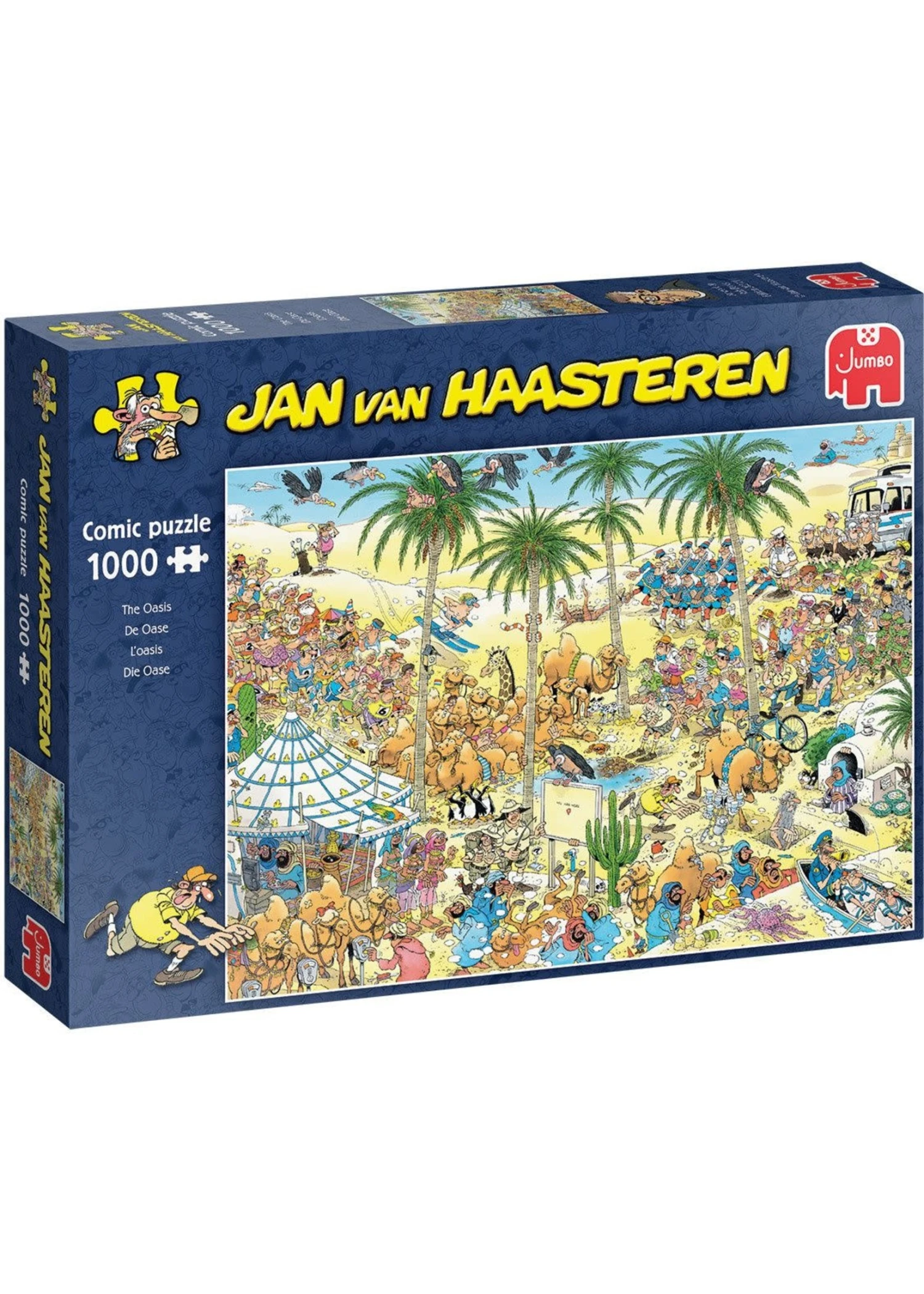 Ontdek de humoristische gedetailleerde puzzel van Jan van Haasteren met als thema De Oase. Leg de 1000 stukjes en ontdek de figuren. De puzzel is geschikt voor kinderen vanaf 12 jaar en ouder. Â