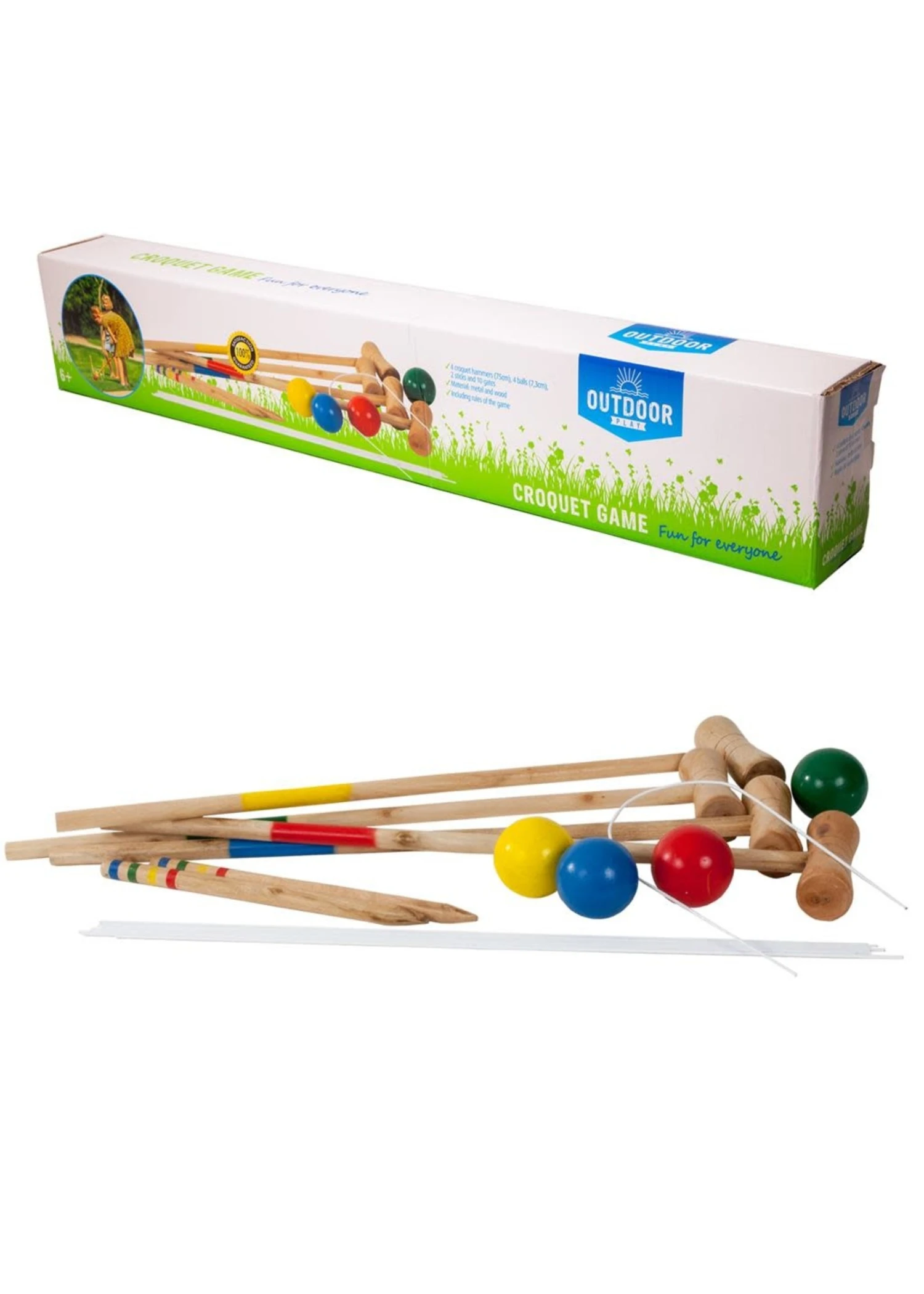 Outdoor Play Croquet Set. Sla zo snel mogelijk jouw eigen ballen door de poortjes en weer terug naar het startpaaltje. De set is van zware kwaliteit en gaat lang mee. Inhoud: 4 croquet hamertjes van 75 cm, 4 ballen van 7,3 cm doorsnee, 2 houten stokken en 10 metalen poortjes. Wordt geleverd in een full-colour doos met uitgebreide handleiding. Geschikt voor kinderen vanaf 6 jaar.