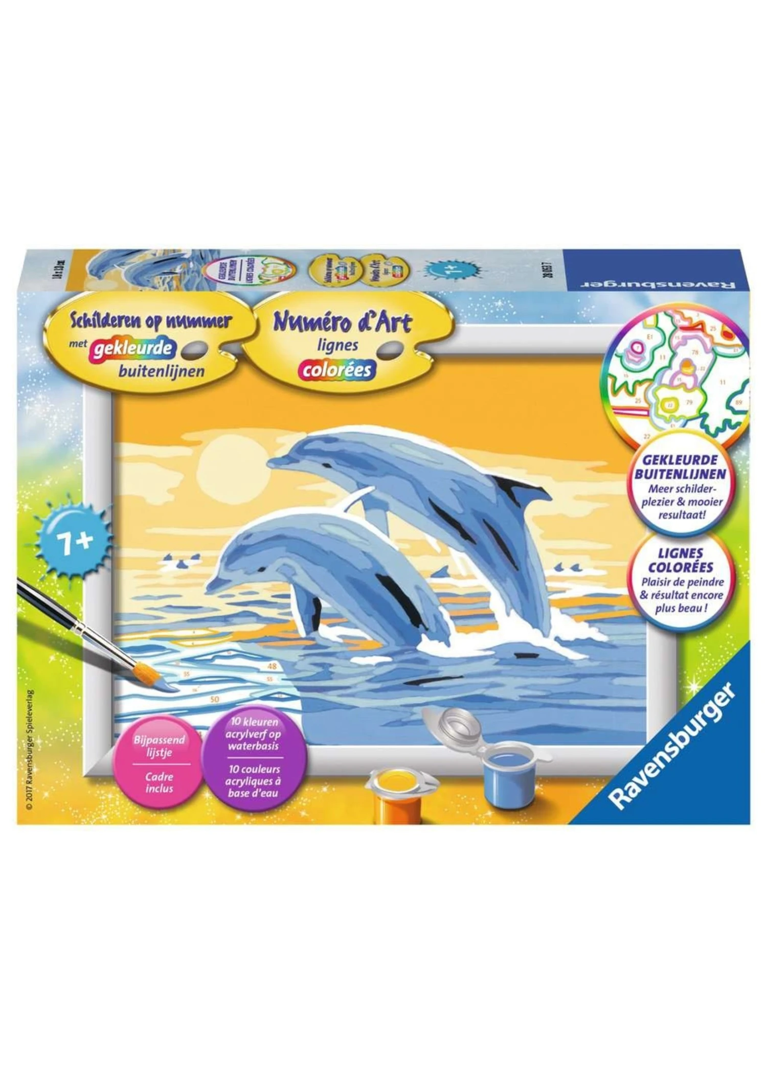 Schilderen op nummer van Ravensburger – iedereen kan schilderen! Dankzij de gekleurde buitenlijnen kunnen kinderen de afbeelding van de springende dolfijnenen de benodigde kleuren sneller herkennen. Zo is het kinderlijk eenvoudig de kunstenaar in jezelf wakker te maken! Met grote schilderoppervlakken en veel verschillende kleuren zijn de schilderplaten van de schilderen op nummer Classic-serie van Ravensburger zeer geschikt voor de jonge kunstenaar. Uitpakken en aan de slag! Onze acrylverf:• droogt snel • is op waterbasis• ruikt niet onaangenaam• maakt penseelreiniger overbodig