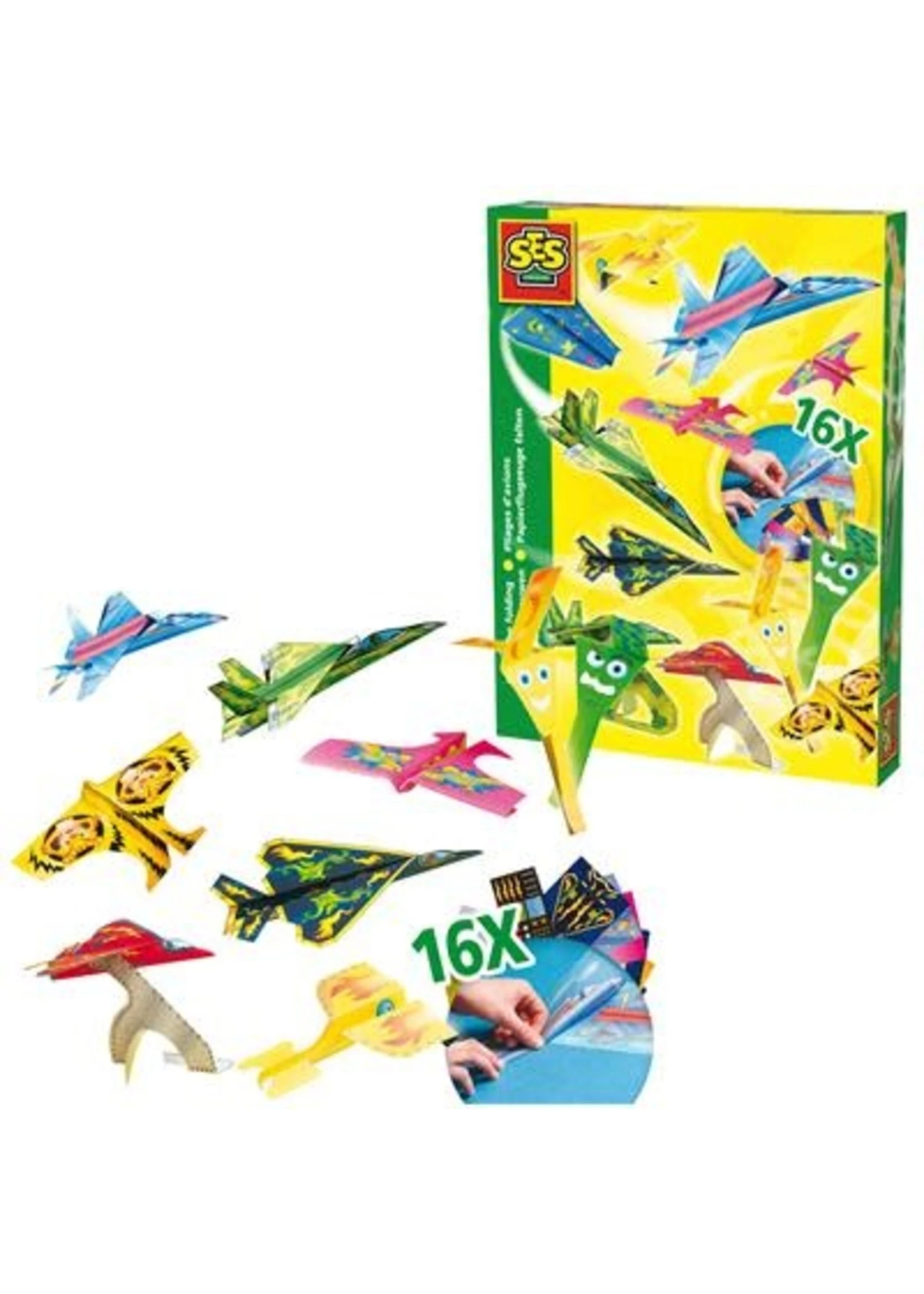 SES vliegtuigjes bouwen. Maak de gekste, grappigste of juist stoerste vliegtuigjes en laat ze door de lucht vliegen! Inhoud: 16 vellen voorbedrukt vliegtuigpapier, vliegtuighouder, stickervel en instructies.
